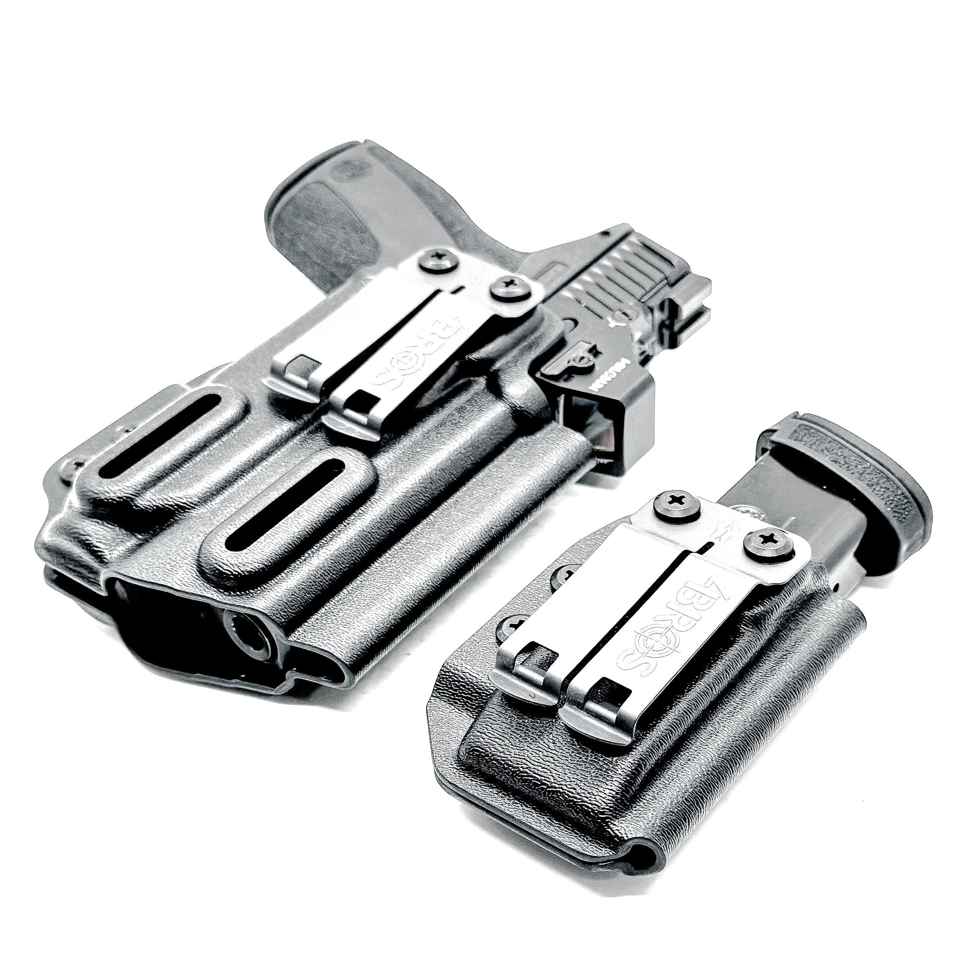 This right- or left-hand inside-the-waistband (IWB) holster and magazine carrier combo is precision-built for the Smith & Wesson M&P Shield X equipped with the Streamlight TLR-7 Sub 1913 footprint. The package includes a Modwing on the holster and your choice of Discreet Carry Concepts Monoblock or Ulticlip UltiTuck belt attachments on both the holster and the mag pouch.